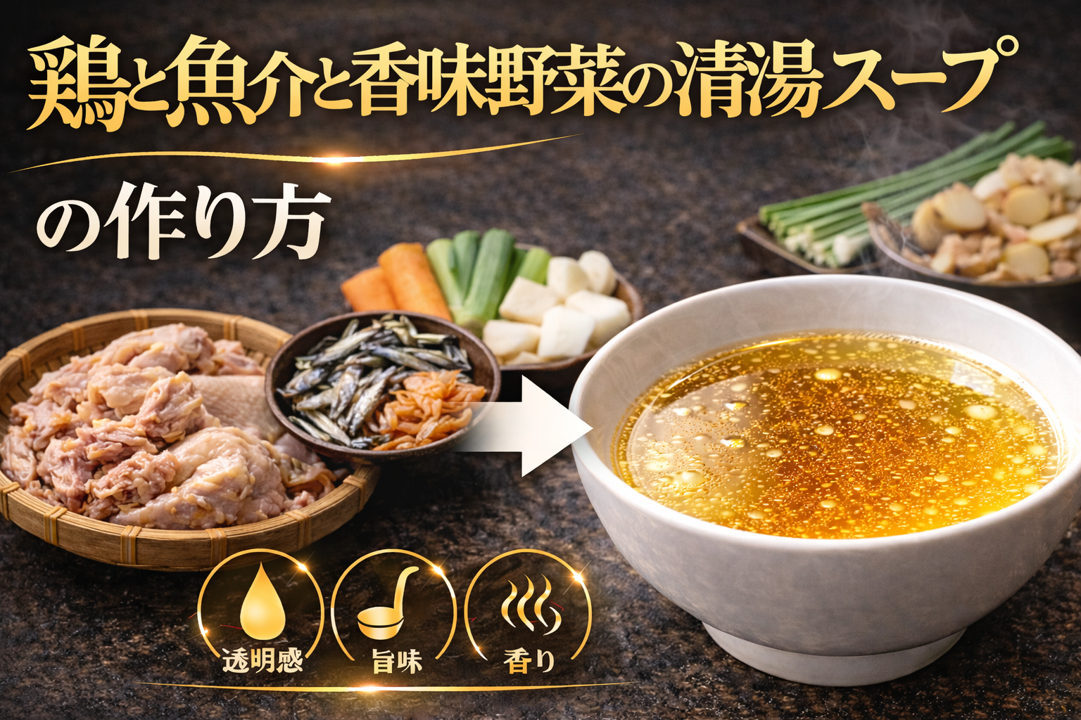 9.鶏と魚介と香味野菜の清湯スープとは