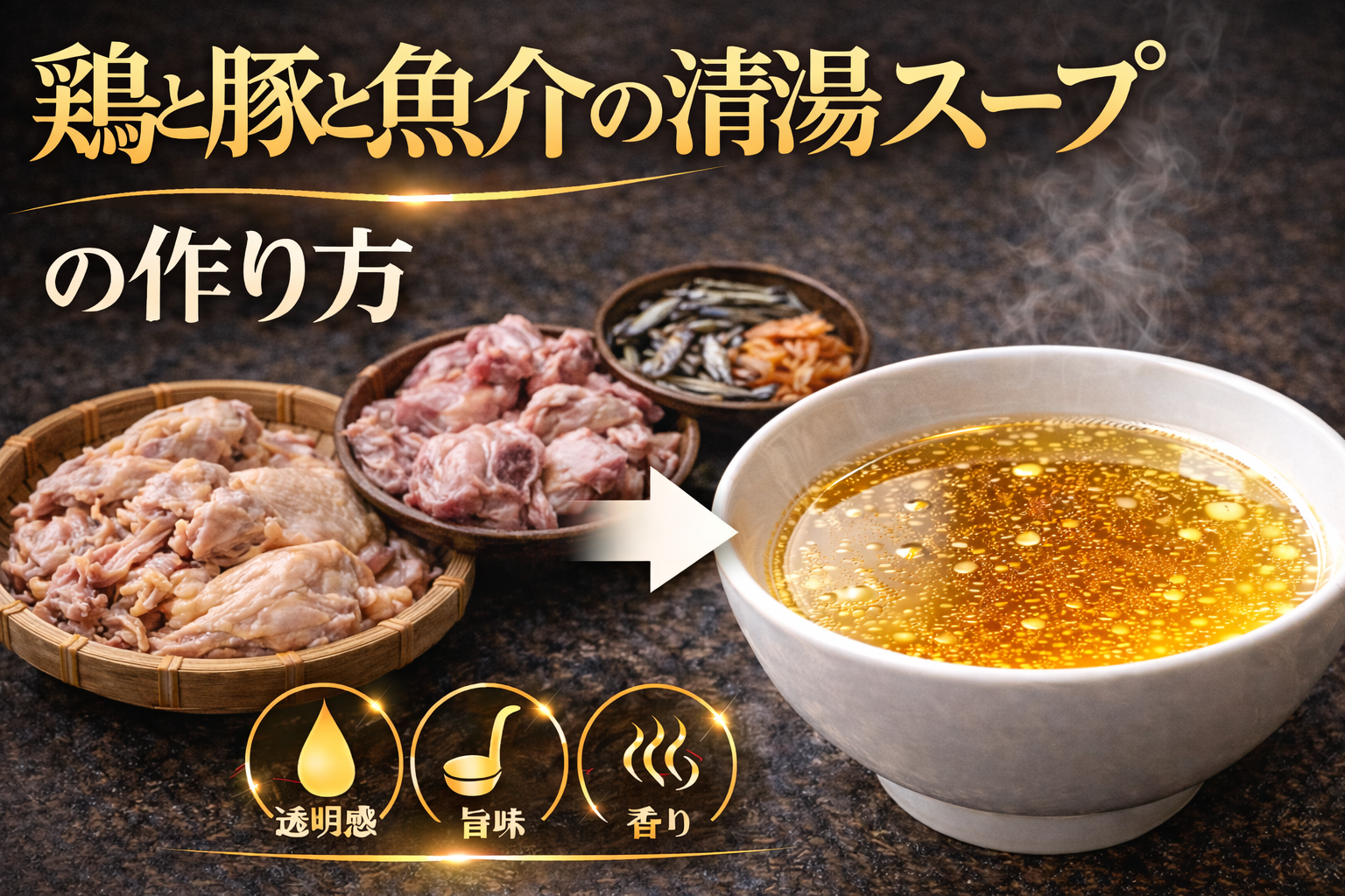 鶏と豚と魚介の清湯スープとは、三種類の動物系・魚介系素材を組み合わせながらも、濁りを抑えて透明に仕上げた複合型スープを指す。この構造を理解するには、「なぜ異なる旨味源を統合するのか」という視点が重要になる。鶏は軽やかでクリアな旨味を担い、豚は脂質とゼラチンによる厚みを補強し、魚介は香りと余韻の方向性を形成する役割を持つ。それぞれ単体でも成立するが、組み合わせることで味のレンジが広がり、単一素材では出せない立体感が生まれる。一方で、豚の脂やコラーゲンは乳化しやすく、魚介は過加熱で雑味が出やすいため、清湯として成立させるには抽出条件の分離と制御が不可欠となる。例えば豚は低温で長時間、魚介は短時間で引き上げるなど、素材ごとに最適な処理を行い、後から統合する設計が取られる。この結果、鶏の透明感を軸にしながら、豚のコクと魚介の香りが重層的に広がる味わいが成立する。つまりこのスープは、異なる特性を持つ素材を分解し再構築することで成立する、高度な統合型の清湯スープである。