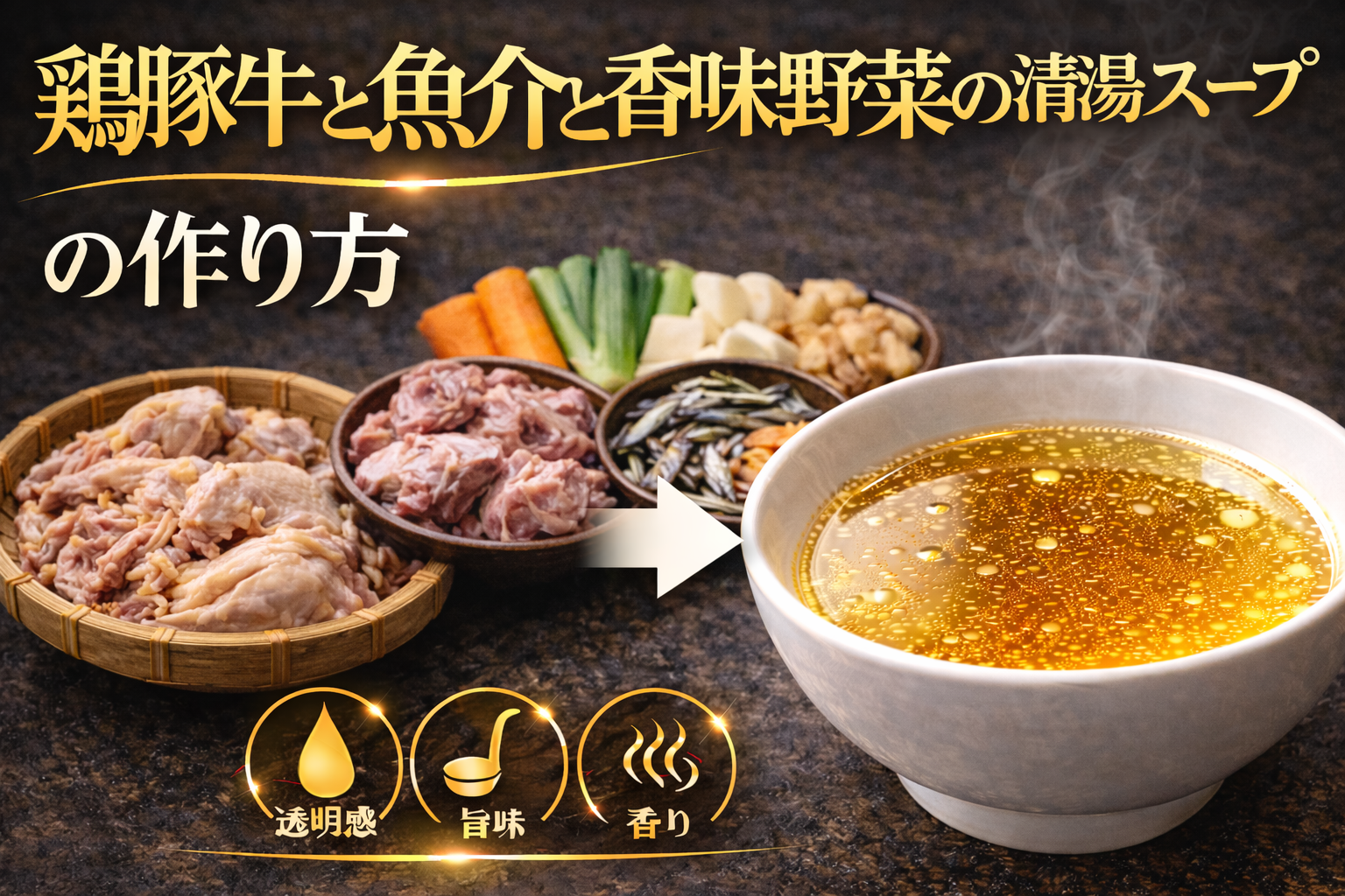 11.鶏豚牛と魚介と香味野菜の清湯スープとは
