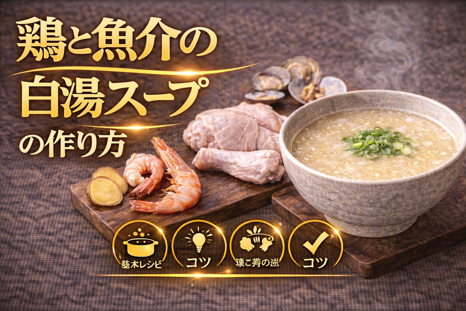 鶏と香味野菜の白湯スープとは、鶏ガラや骨を強火で長時間煮込み、白く濁らせた濃厚なスープに、ねぎや生姜、にんにくなどの香味野菜を加えたもの。コク深くまろやかな味わいで、旨味が凝縮され、ラーメンや鍋料理などのベースとして広く使われる。