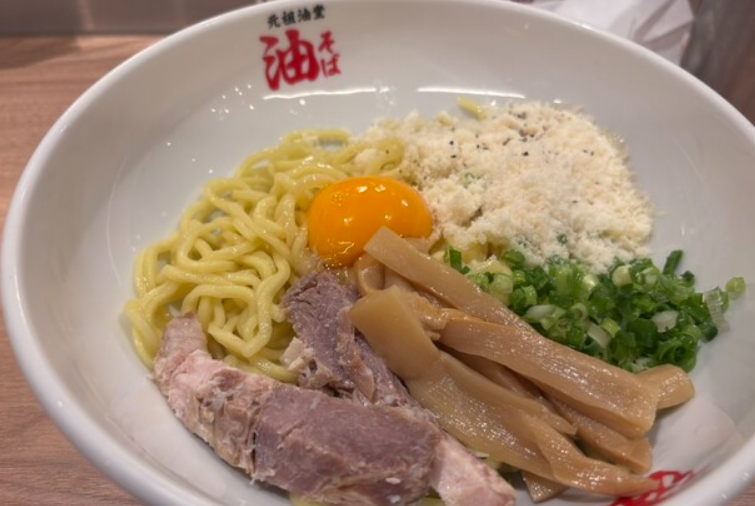ラーメンではなく“油そば”で勝負する人気店「元祖油堂」。特製のタレと香味油を絡めた一杯は、濃厚でコクがありながらも意外とさっぱりとした後味が特徴です。麺は太めでモチモチとした食感が楽しめ、卵黄やチャーシュー、ねぎ、メンマとの相性も抜群。卓上の酢やラー油を加えて味変を楽しめば、最後まで飽きずに完食できます。シンプルながら奥深い味わいがクセになり、リピーターも多いお店。ボリューム・コスパ・味の三拍子がそろった油そば専門店です。