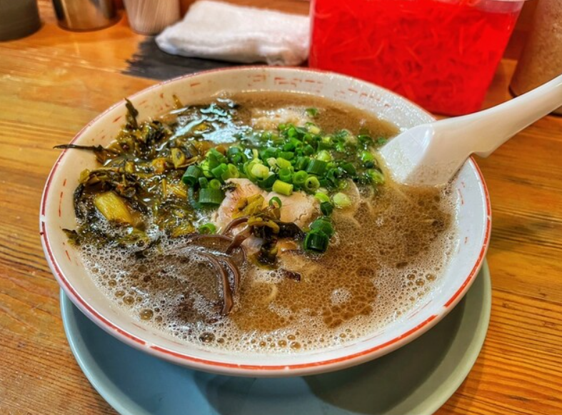 極細麺との相性が抜群で、替え玉を頼む人も多数。卓上の辛子高菜や紅しょうがで好みの味にカスタマイズできるのも嬉しいポイント。
