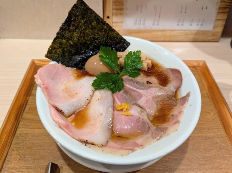 麺は国産小麦を使用した自家製中細麺で、口に含むと小麦の香りがふわりと広がり、スープとの相性が抜群。トッピングの鶏チャーシューは低温調理で驚くほどしっとりと仕上げられています。店内は落ち着いた和モダンな空間で、ラーメン店というより割烹のよう。関西屈指の食通たちも絶賛する“美しすぎる一杯”は、梅田訪問時に外せない名店です。
