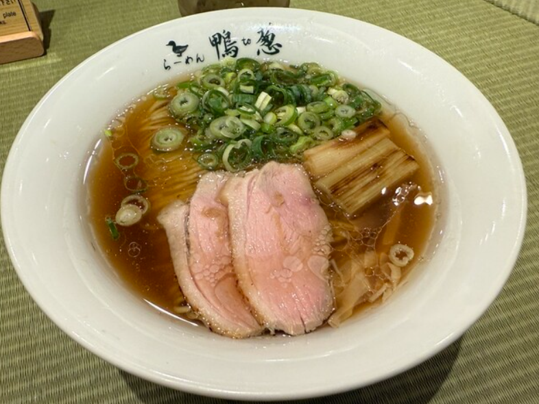 トッピングには3種のネギが添えられ、食感と香りの変化が楽しめる構成。低温調理の鴨チャーシューはしっとりと柔らかく、まさに高級鴨料理のような味わい。