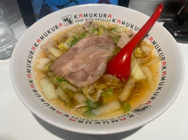 大阪を代表するご当地ブランド「神座(かむくら)」は、甘めのスープが特徴的な一杯。白菜がたっぷり入った優しい味わいは、ラーメン初心者や女性にも人気。スープは透明感のある醤油ベースで、ほんのり甘く後を引く美味しさです。