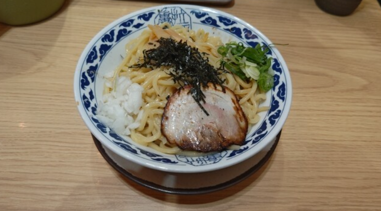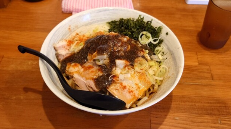 特製まぜそばには、卵黄・チャーシュー・ネギ・玉ねぎが美しく盛り付けられ、見た目にも食欲をそそります。途中でお酢やブラックペッパーを加えることで味変が楽しめ、最後まで飽きないのも魅力。ヘルシー志向のラーメンファンにもおすすめの一杯です。