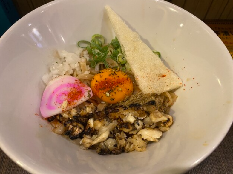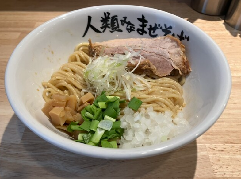 「人類みな麺類」系列のまぜそば専門店。魚介系ダレと鶏油を組み合わせたまぜそばは、旨味と香ばしさが一体となった中毒的な美味しさ。