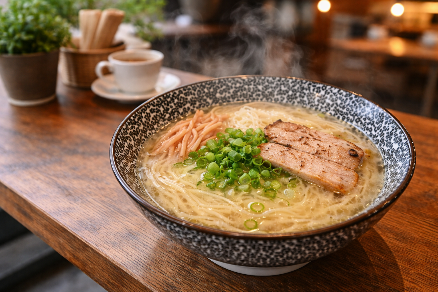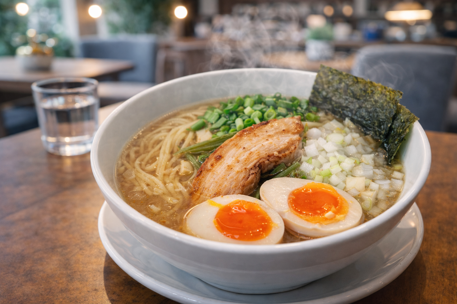 落ち着いた雰囲気の中で上品な一杯を味わえる「玄屋」。スープは魚介と鶏をベースにした淡麗系。澄んだ黄金色のスープは一口で旨味が広がり、繊細な香りが鼻を抜けます。麺は中細ストレートで喉ごしがよく、軽やかな口当たり。トッピングには低温チャーシュー、メンマ、白髪ねぎなど、シンプルながら美しいバランス。塩・醤油どちらも絶妙な完成度を誇り、あっさり派には特におすすめ。“静かに美味しい”を体現する、知る人ぞ知る実力派ラーメン店です。