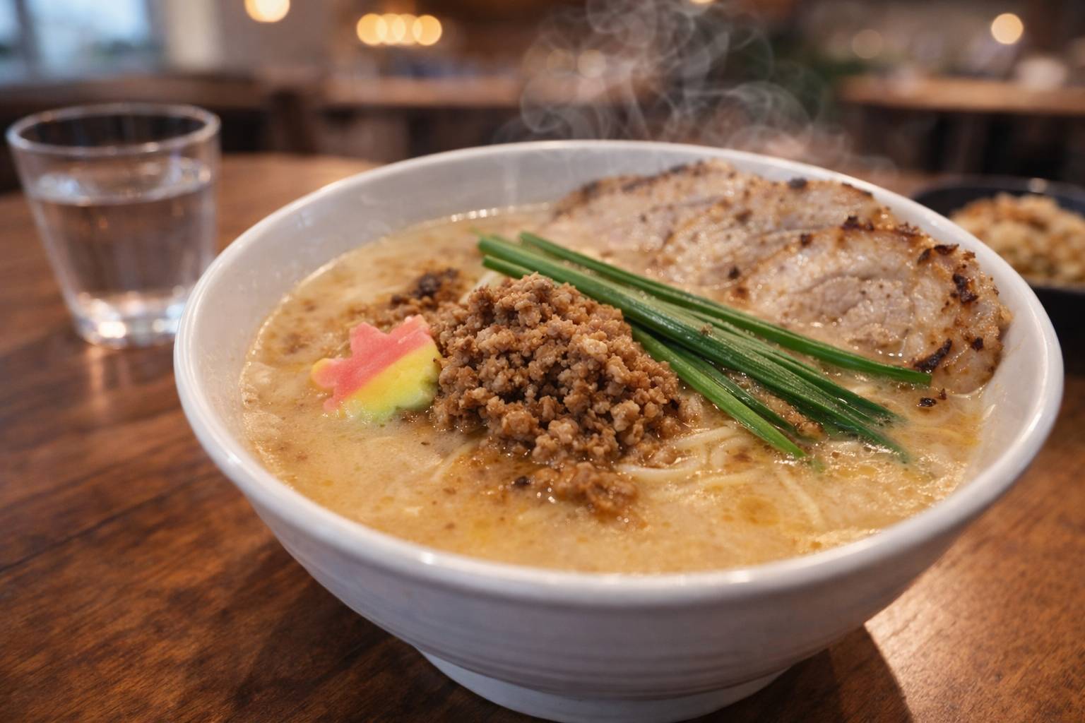 スープは味噌の香ばしさが際立ち、深いコクとまろやかさが魅力。太めのちぢれ麺がスープをしっかり受け止め、野菜の甘みが全体を引き立てます。炒め野菜や焦がしニンニクがアクセントとなり、食べ応え満点。寒い季節はもちろん、一年を通して味噌の奥深さを堪能できる一軒です。“味噌好きの聖地”として、多くのリピーターが足を運んでいます。