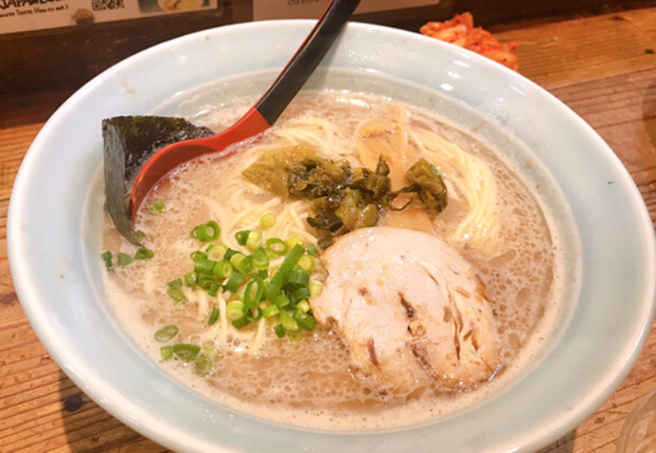 スープはライトな豚骨で飲みやすく、コクもあり、朝からでも食べられる味わい。麺は中太で、柔らかめの茹で加減が特徴。