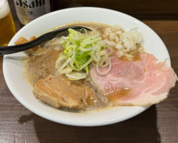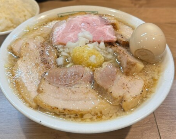 濃厚系を求めて小作に来るなら、まず押さえておきたいのが「らーめん つけめん 虎テツ」。豚骨ベースのしっかりしたスープに、太めの麺が組み合わさる、“ガツンと来る系”の代表格です。スープは旨味が濃く、背脂や脂のコクも感じますが、しょっぱすぎず意外と飲みやすい絶妙なバランス。ニンニクの効かせ方や味の濃さは、好みに合わせて調整できるので、自分仕様の一杯を作れる楽しさがあります。麺は太めでモチモチとした弾力があり、しっかり噛んで味わうタイプ。濃厚なスープと絡むと、“THE・がっつりラーメン”という満足感が一気に押し寄せます。チャーシューも分厚く、口に入れるとホロっと崩れる柔らかさ。ボリュームたっぷりなのに、最後まで勢いよく食べ進められる、クセになる一杯です。