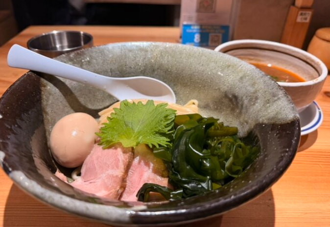 麺場 風天は、つけ麺とラーメンの両方で人気を集める店で、特に濃厚魚介系つけ麺の完成度が高いことで知られています。つけ汁は豚骨と魚介を合わせたどろっとしたタイプで、節や煮干しの香りがしっかり立ち、太麺をくぐらせると、まさに“麺を食べるソース”のようなリッチな味わいに。麺はコシの強い極太で、冷水でしっかり締められており、噛むたびに小麦の香りが広がります。ラーメンはつけ麺より少しライトなバランスで、気分に合わせて選べるのも嬉しいポイント。麺量を増やせるメニューも多く、がっつり派の胃袋も満足させてくれる一軒です。