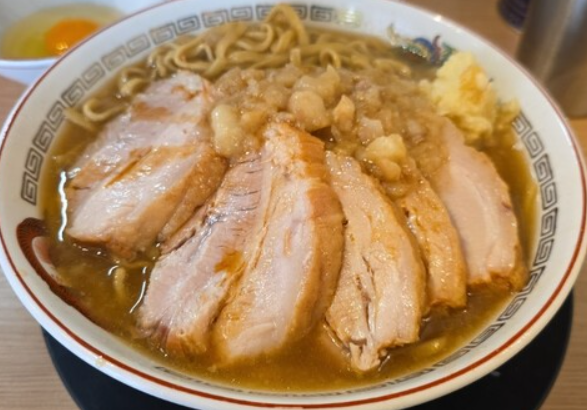 「弁慶」は“濃厚背脂ラーメン”の代名詞とも言える名店で、門前仲町店は越中島ユーザーにも非常に馴染み深い一軒。スープは豚骨+鶏ガラをベースに大量の背脂をチャッチャした重厚系で、ひと口目から“甘み・旨み・脂のコク”が押し寄せる強烈なパンチ力が魅力。見た目はギトギトですが、醤油ダレのキレがしっかりしているため飲みにくさはなく、背脂の甘みでむしろスープ全体の輪郭が見事に整います。麺は太めの縮れ麺で、ワシワシと食べる“豪快な食感”が背脂醤油と完璧にマッチ。チャーシューも肉厚で、噛むと豚の旨みがにじみ出る力強い仕上がり。“今日は絶対に濃い味気分!”という日に最適な一杯で、夜遅くまで営業しているのも嬉しいポイント。