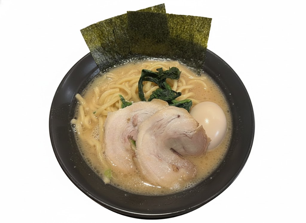 「中井家」は、家系ラーメンの特徴である“濃厚豚骨×醤油のキレ×太麺”の三拍子をしっかり押さえた実力派で、駅から近いこともあり中井住民が気軽に訪れる“日常家系”として定着しています。白濁したスープは豚骨の旨みをしっかり引き出しながらも臭みがなく、醤油ダレが強めに効いているため、レンゲを入れた瞬間に広がる力強い香りが食欲を刺激します。太麺はモチモチの弾力で存在感があり、スープ、海苔、ほうれん草とのバランスは典型的な家系の黄金比。チャーシューは脂身と赤身のバランスがよく、ご飯との相性も抜群で、卓上のにんにく・豆板醤・生姜で味変すれば、まったく別の表情を見せるのも楽しみの一つ。“気取らずガッツリいきたい日”に強烈な安心感を与えてくれる、地域密着型の濃厚家系です。