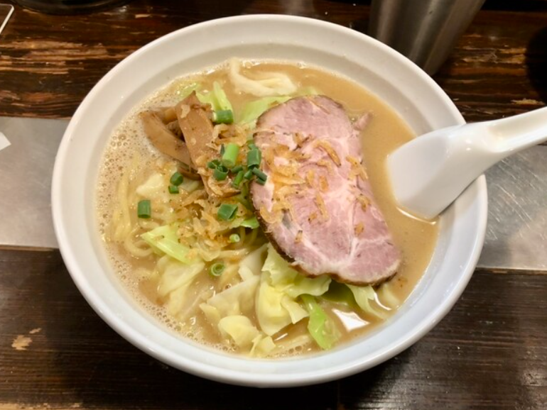 炒めた野菜の香ばしさがスープに移り、動物系出汁と合わさることで、濃厚なのに飽きのこない力強い味わいに仕上がります。麺は太めで、野菜やスープと絡んで満足度抜群。