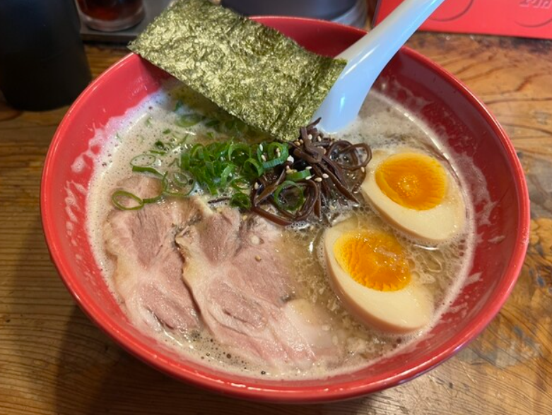 一蘭 東大和店は、もはや説明不要とも言える“とんこつラーメンの全国ブランド”で、自分好みにカスタマイズできるオーダーシートと、仕切りのあるカウンターで知られるお店です。スープは博多系豚骨の王道スタイルで、臭みを抑えつつも豚骨のコクと香りをしっかり残した、クリーミーかつスッキリとした味わい。秘伝の赤いタレを加えることで、辛味と香りがプラスされ、ひと口ごとにスープの印象が変化していきます。麺は極細ストレートで、替え玉前提の軽やかなポーション。固さを細かく指定できるため、自分にとってベストな茹で加減を見つけるのも楽しみの一つです。深夜帯まで営業していることも多く、“とにかく安定した博多とんこつを、ひとりで黙々と味わいたい”というときに最適な一軒と言えるでしょう。