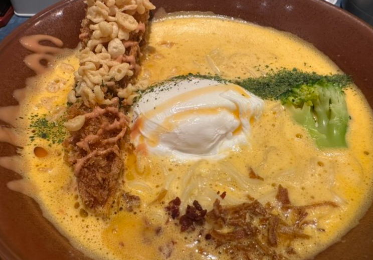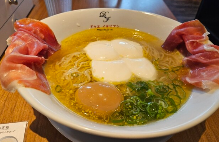 「黄金の塩らぁ麺」で有名なドゥエイタリアン。看板の“らぁ麺フロマージュ”は、ラーメン×チーズという斬新な組み合わせを高次元で成立させた革新的な一杯。鶏清湯の透明感あるスープと、濃厚で芳醇なチーズのコントラストによって、驚きと美味しさが同居する非常にモダンな味わいに仕上がっています。麺は細めで軽やか、チーズと絡むことでパスタのような風味もあり、ラーメンの新しい形を体験できます。女性人気が特に高い名店です。