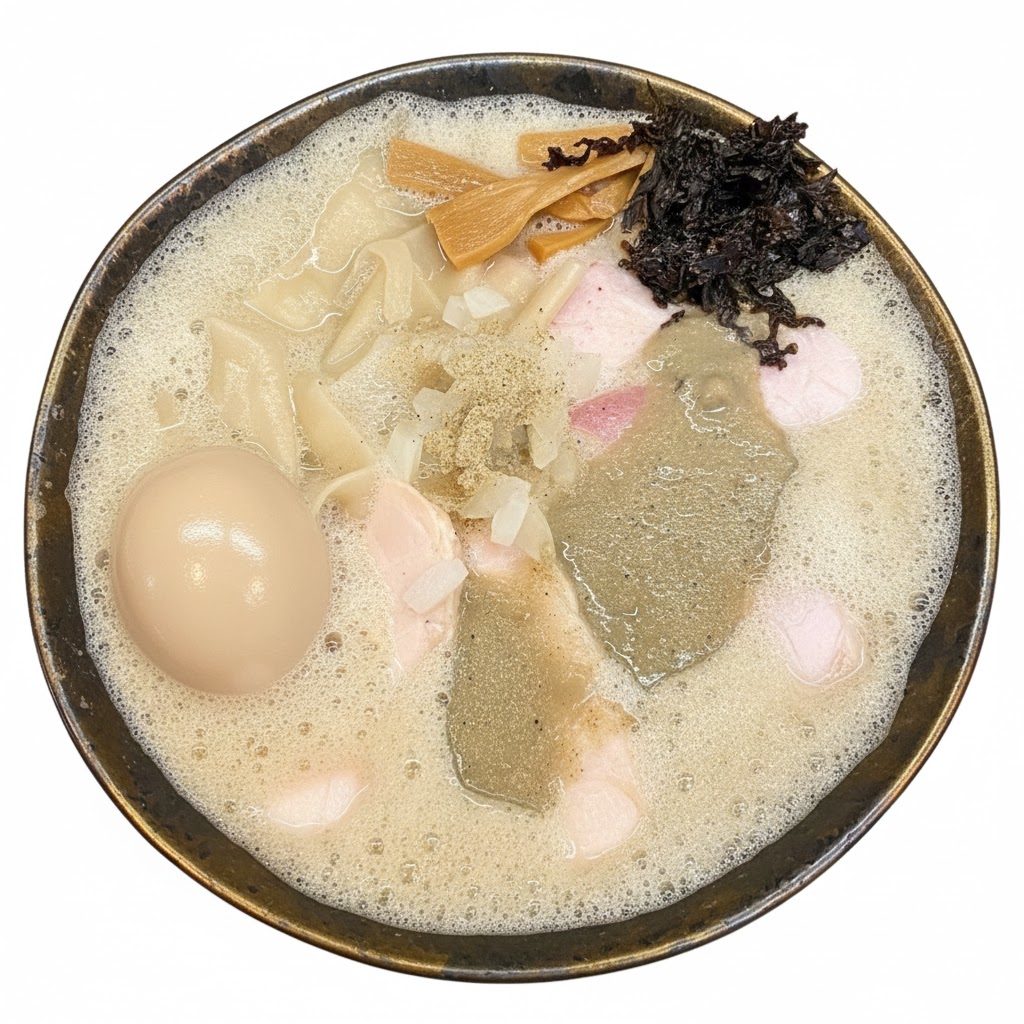 海老丸らーめんは、神保町駅周辺のラーメン店の中でも、素材の主張が極めて明確な名店であり、海老という素材をここまで前面に押し出しながら高い完成度を維持している点が際立っています。スープは海老の香りと旨みを凝縮した濃厚な仕上がりで、一口目から強烈なインパクトを与えつつも、単調にならないよう繊細な調整が施されています。クリーミーさと香ばしさのバランスが非常に良く、食べ進めるほどに海老の甘みやコクが広がっていきます。麺やトッピングもスープとの一体感を意識して構成されており、全体として非常に完成度の高い「一皿」として成立しています。神保町という食の多様性が集積した街において、強い個性を武器に確固たる地位を築いている名店です。