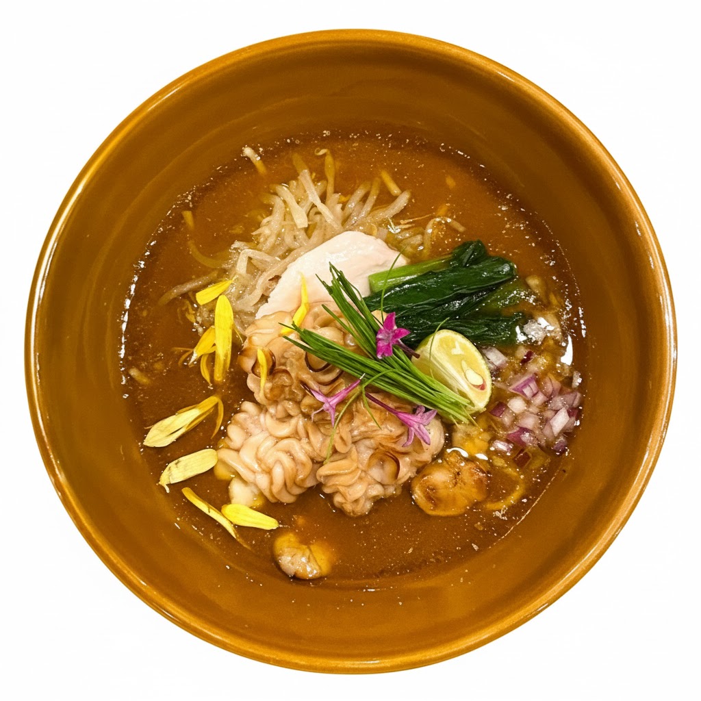 僕の、薬膳麺。は、神保町駅周辺のラーメン店の中でも極めて異色かつ完成度の高い存在であり、単なる「変わり種」にとどまらない確固たる評価を獲得しています。スープは薬膳の考え方をベースに構築されており、複数の素材が複雑に絡み合いながらも、決して飲みにくさや癖の強さを感じさせない設計となっています。一口目は優しく、穏やかな印象を受けますが、食べ進めるにつれてじわじわと旨みと香りが積み重なり、身体に染み込むような感覚を覚える構成です。麺や具材もスープの思想に合わせて選ばれており、ラーメンという枠を超えた「一杯の料理」として成立しています。刺激やボリュームを求める人には向かないかもしれませんが、神保町という知的好奇心の強い街において、こうした方向性が高く評価されている点は非常に象徴的であり、記憶に強く残る一杯です。