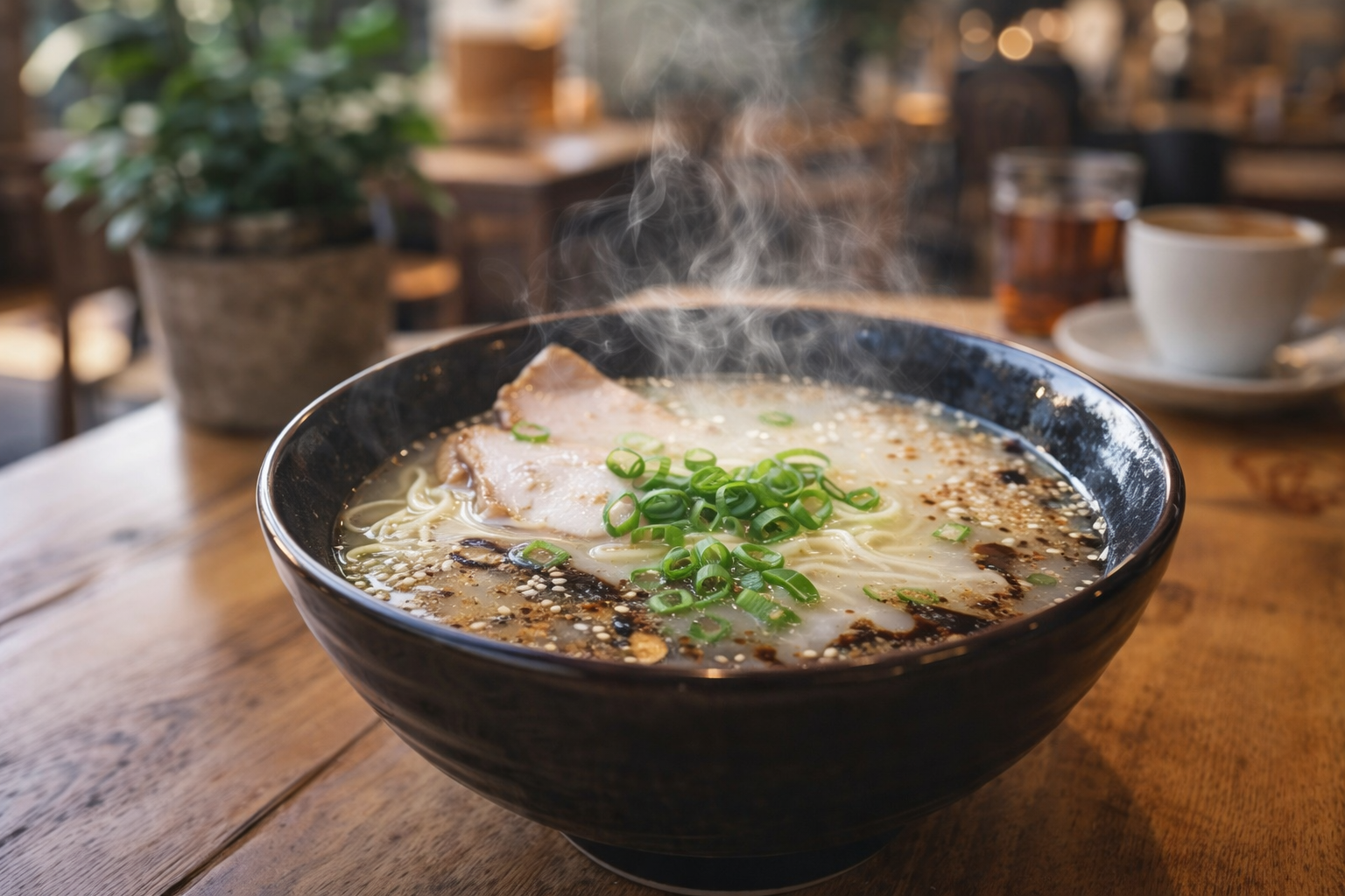 「なんつッ亭 川崎店」は、黒マー油が特徴的な豚骨ラーメンで知られる人気店。豚骨スープは濃厚ながら臭みがなく、クリーミーでまろやかな味わいに仕上がっています。そこに加えられる焦がしニンニク油(マー油)の香ばしさがスープ全体を引き締め、奥行きのある味を演出。麺は中細ストレートで、濃厚なスープとバランス良く絡みます。チャーシューはトロトロに煮込まれており、食べ応えも十分。口コミでは「マー油の香りがクセになる」「一度食べると忘れられない」と好評。八丁畷エリアでパンチの効いた豚骨を求める方におすすめです。