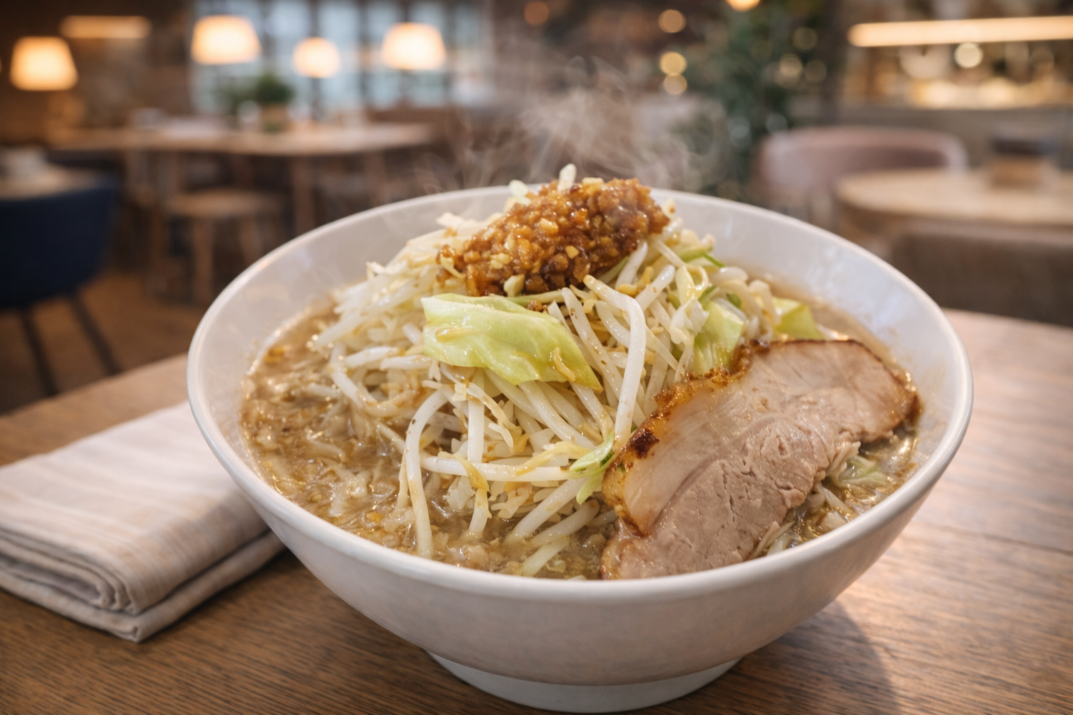 「山勝角ふじ 新三郷店」は、ボリューム満点の二郎系ラーメンが楽しめる人気店です。濃厚な豚骨醤油スープに、太くもちもちの自家製麺がしっかり絡み、野菜マシや背脂増しなど自分好みにカスタマイズ可能。がっつり系ラーメン好きにはたまらない一杯で、男性客を中心に高い支持を集めています。店内はカウンター席中心で回転も早く、ランチタイムでも比較的スムーズに入店可能です。口コミでは「ガッツリ食べたい時に最適」「コスパが良い」といった声が多く、満腹必至のラーメン体験ができます。