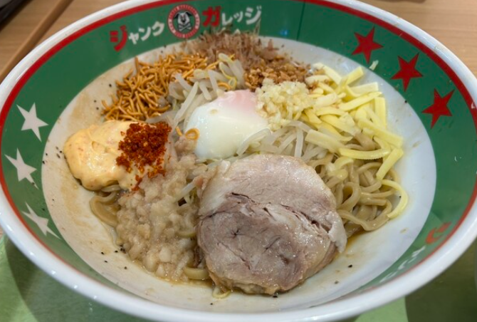 「ジャンクガレッジ 越谷レイクタウン店」は、ボリューム満点の二郎系ラーメンが楽しめる人気店です。太くもちもちした麺に、こってり濃厚な豚骨醤油スープが絡み、野菜マシやニンニク増しなど自分好みにカスタマイズ可能。チャーシューは厚切りで食べ応え抜群、インパクトのある一杯が特徴です。店内はカウンター席中心で活気があり、学生や男性客を中心に人気があります。口コミでは「ガッツリ食べたいときに最適」「濃厚だけどクセになる」との声が目立ちます。
