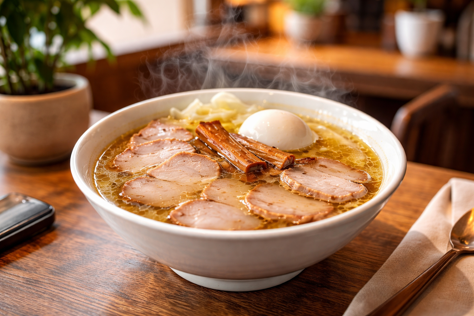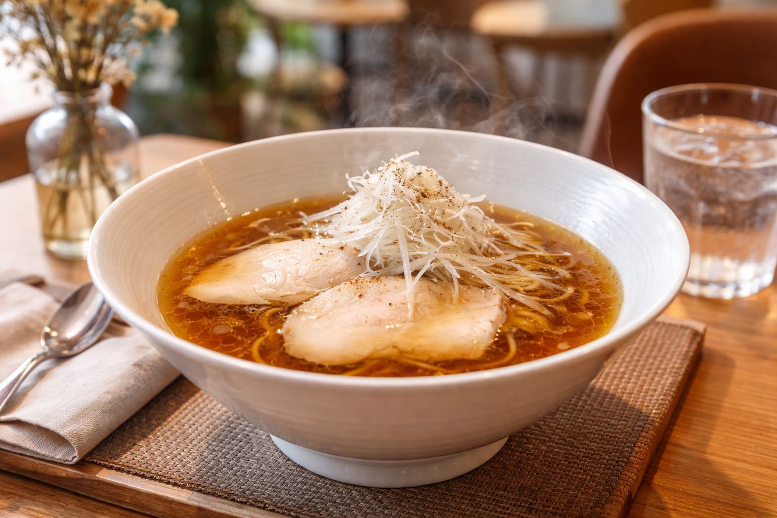 「中華そば さとう 大船店」は、昔ながらの中華そばを現代風に昇華させた名店。鶏ガラと煮干しをベースにしたスープは、澄んだ見た目ながらコク深く、最後まで飲み干したくなる味わいです。麺は中細ストレートで、スープとの一体感が抜群。トッピングのチャーシューはしっとり柔らかく、メンマやネギとのバランスも絶妙です。口コミでは「懐かしいけれど新しい」「子どもから大人まで楽しめる」と評判。あっさり派にもうれしい一杯で、幅広い層に愛されています。