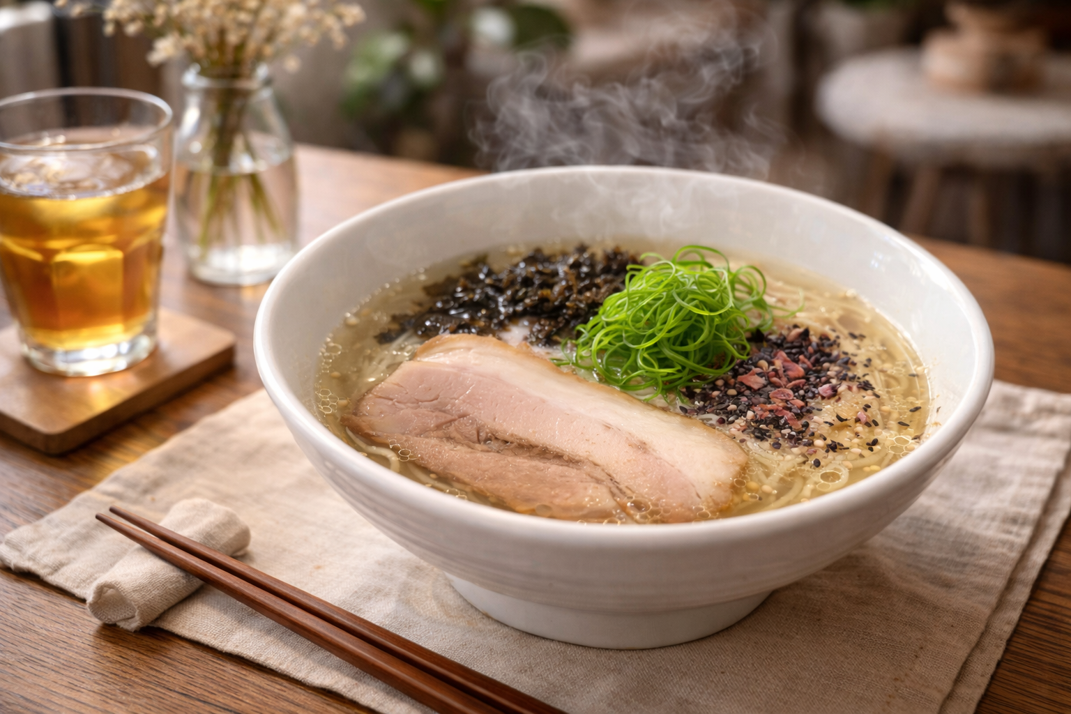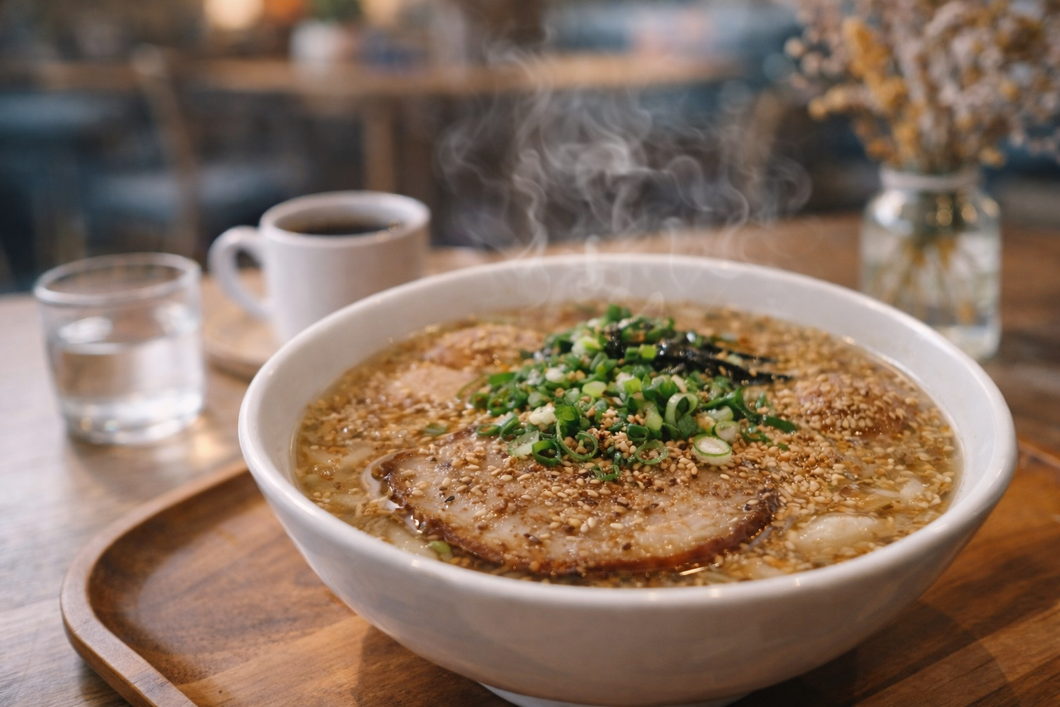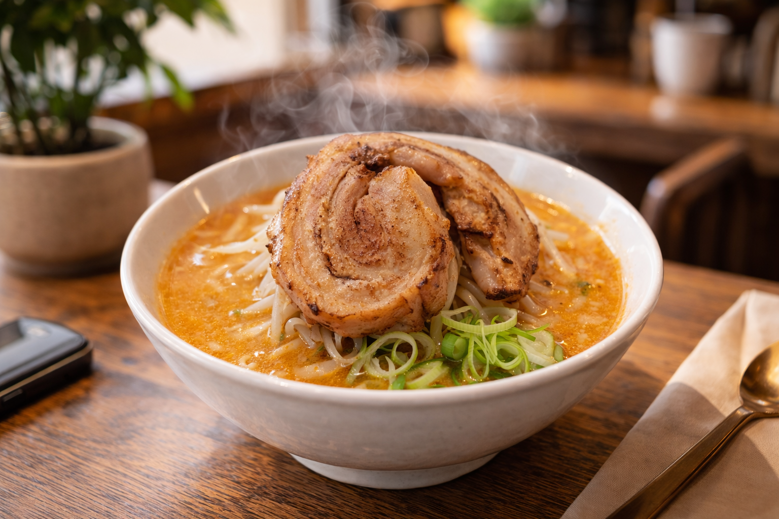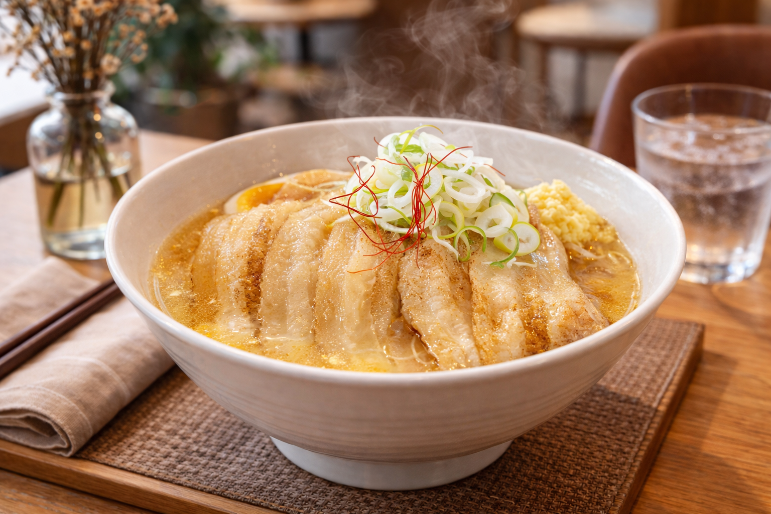 「カミカゼ」は、ユニークなネーミングと実力派の味で知られる人気店。豚骨と魚介を組み合わせたスープは濃厚ながらキレがあり、後味はすっきりと仕上がっています。麺は中太のストレートで、弾力がありながらスープをしっかり持ち上げるのが特徴。トッピングのチャーシューは香ばしく炙られており、食欲をそそる香りが広がります。口コミでは「パンチのある味わい」「クセになる」と高評価。名前のインパクトだけでなく、味でもしっかりファンを掴んでいる実力店です。