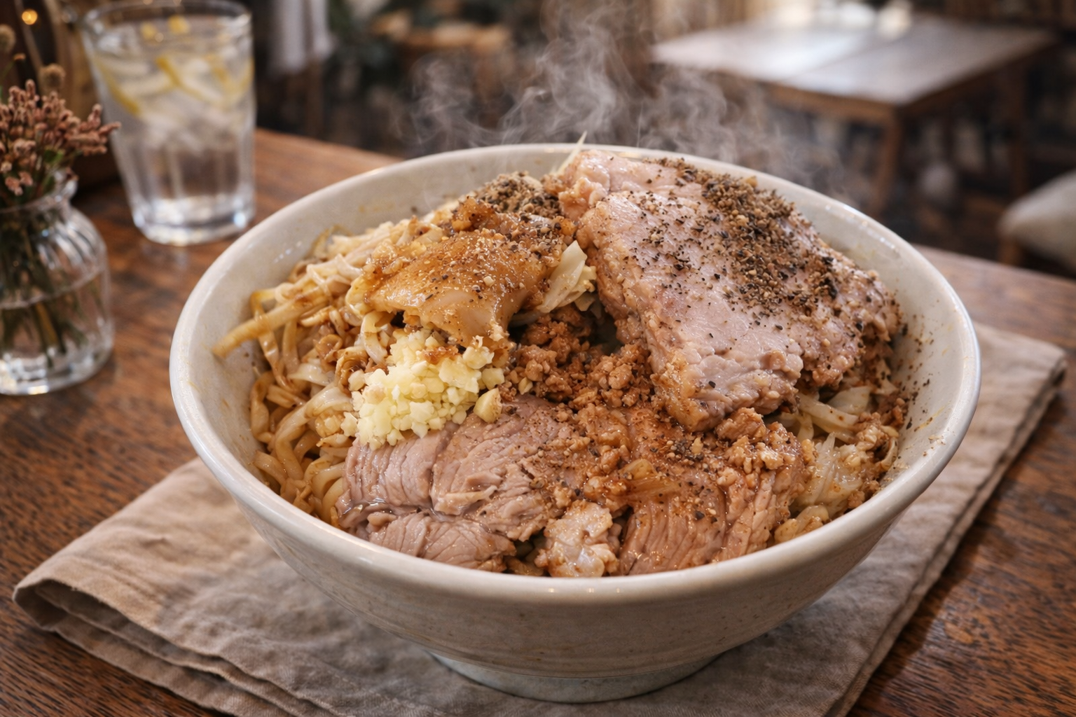 二郎インスパイア系のガッツリ系ラーメン店。極太麺に濃厚スープ、山盛りの野菜と分厚いチャーシューで満足度は抜群。食欲旺盛な学生や若者に大人気で、ボリュームを求めるなら外せないお店です。
