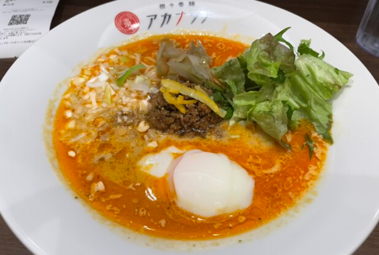 中華系のメニューとラーメンが融合した「アカナツメ」。担々麺や辛味系ラーメンを中心に展開しており、スパイシー好きにおすすめ。異国感のある味わいと香り豊かなスープは、エスニックな気分を楽しめます。