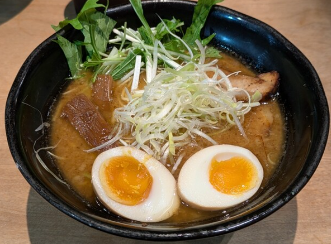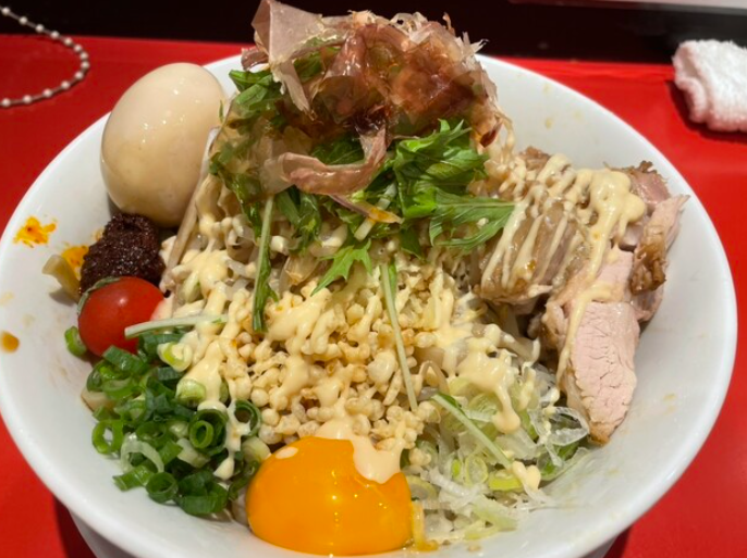 「覆麺 智」は、個性的で中毒性のある一杯を提供する竹橋エリア屈指の人気店。特徴的なのは黒胡椒を効かせたパンチのあるスープで、濃厚な醤油ベースにスパイス感が加わり、クセになる味わいが魅力です。トッピングのチャーシューは分厚くジューシーで、食べ応え十分。さらに煮卵や野菜のバランスも良く、見た目の迫力も印象的です。限定メニューや日替わりの特製ラーメンも提供されており、常連客を飽きさせない工夫がされています。店名の通り覆面をつけたスタッフが迎えてくれるユニークな演出も話題で、ラーメンファンにとって特別な体験ができるお店です。